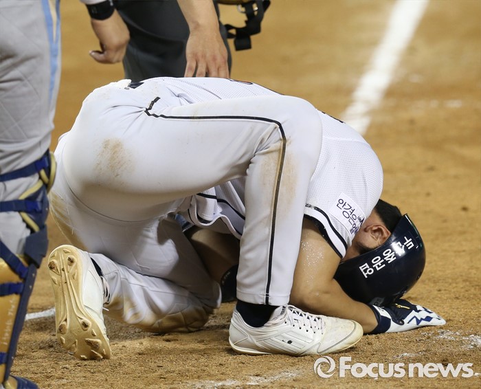 (서울=포커스뉴스) 28일 서울 잠실구장에서 열린 2016 프로야구 NC-두산 경기 5회말 두산 김재호가 NC 투수 이민호의 투구에 왼쪽 팔을 맞고 타석에 엎드려 있다.