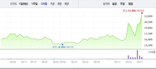 경보제약은 29일 9시26분 현재 전일 대비 9.90%(2000원) 상승한 2만2200원에 거래되고 있다. 경보제약은 27일과 28일에도 각각 17.16%, 2.02%의 상승폭을 기록했다.