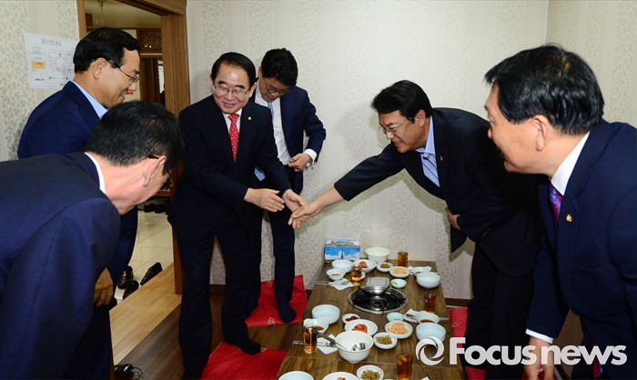 (서울=포커스뉴스) 정진석 새누리당 원내대표가 29일 오후 서울 여의도 한 음식점에서 열린 복당 의원들과의 오찬에 참석해 의원들과 인사하고 있다. 왼쪽부터 김도읍 원내수석부대표, 주호영 의원, 박명재 사무총장, 장제원 의원, 정 원내대표, 안상수 의원.
