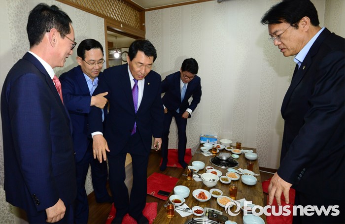 (서울=포커스뉴스) 정진석 새누리당 원내대표가 29일 오후 서울 여의도 한 음식점에서 열린 복당 의원들과의 오찬에 참석해 의원들과 인사하고 있다. 왼쪽부터 김도읍 원내수석부대표, 주호영, 안상수, 장제원 의원, 정 원내대표.