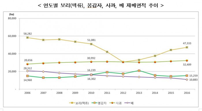 29일 통계청이 발표한 '2016년 보리, 봄감자, 사과, 배 재배면적 조사 결과'에 따르면 올해 보리 재배면적은 4만7333ha로 전년보다 6.9%(3041ha) 증가했다.