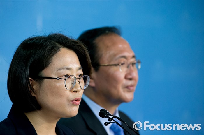 (서울=포커스뉴스) 29일 오후 서울 여의도 국회 정론관에서 미래창조과학방송통신위원회 재배정을 요구하며 농성에 들어갔던 추혜선(왼쪽) 정의당 의원과 노회찬 원내대표가 농성을 해제하고 외교통일위원회 배정을 받아들이는 내용의 기자회견을 하고 있다.