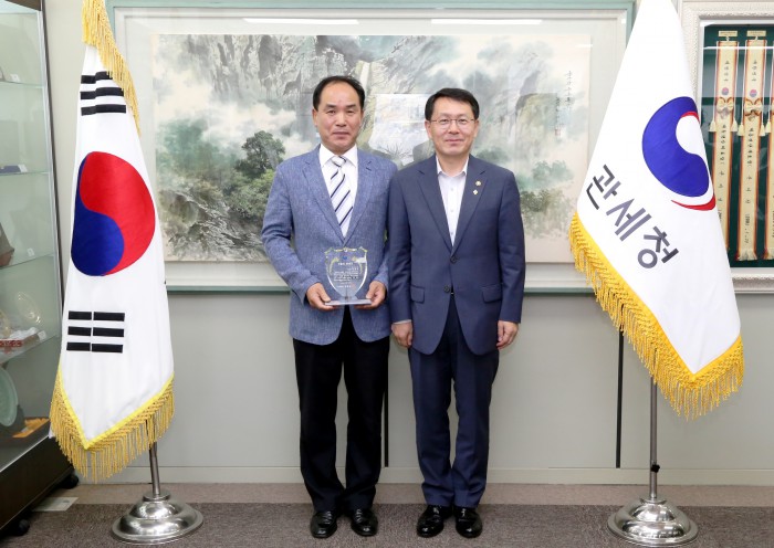 중소기업지원분야에는 평택 지역 고등학교와 대학교에 자유무역협정 관련 전문 강좌를 개설하는 등 맞춤형 인재 육성 및 취업박람회를 연 김평원 평택세관 관세행정관이 영예를 안았다.29일 천홍욱 관세청장(사진 오른쪽)이 6월의 관세인에 선정된 이종찬 인천세관 관세행정관과 기념촬영을 하고 있다. <사진=관세청>