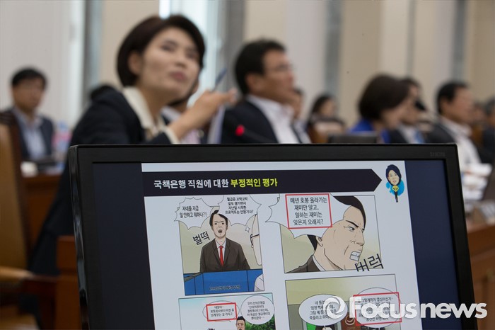 (서울=포커스뉴스) 한정애 더불어민주당 의원이 29일 오후 서울 여의도 국회에서 열린 환경노동위원회 전체회의에서 고용노동부에서 만든 성과연봉제 웹툰을 비판하고 있다.