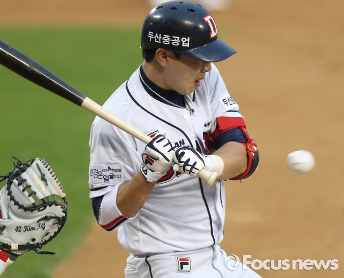 (서울=포커스뉴스) 29일 서울 잠실구장에서 열린 2016 프로야구 NC-두산 경기 3회말 두산 박건우가 타격 도중 몸쪽으로 볼이 날아오자 피하고 있다. 볼이 배트에 맞아 파울이 되었다.