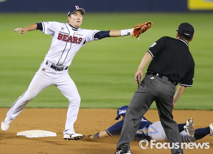 (서울=포커스뉴스) 29일 서울 잠실구장에서 열린 2016 프로야구 NC-두산 경기 9회초 1사후 우전 안타로 진루한 NC 박민우가 나성범 타석때 2루 도루에 성공하고 있다.