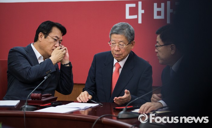 (서울=포커스뉴스) 정진석(왼쪽) 새누리당 원내대표가 30일 오전 서울 여의도 당사에서 혁신비상대책위원회의를 하던 중 전화를 받고 있다.