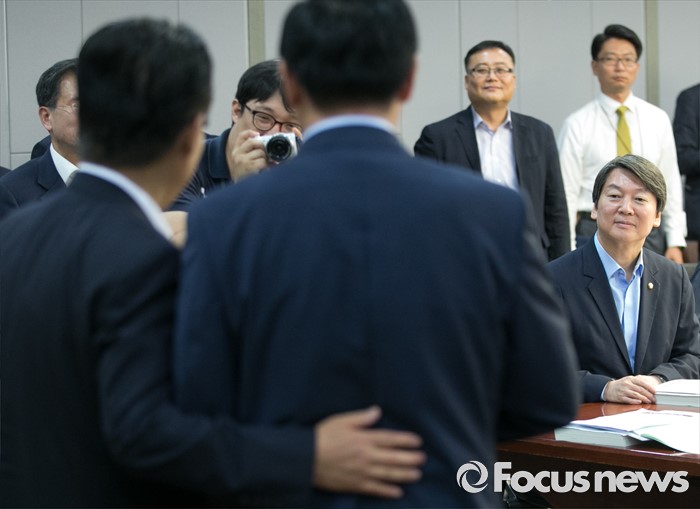 (서울=포커스뉴스) 30일 오전 서울 여의도 국회 의원회관에서 열린 국민의당 22차 집중역량강화 워크숍에 참석한 안철수(오른쪽) 전 대표가 박지원 비대위원장이 우수의원들에게 시상하는 모습을 지켜보고 있다.