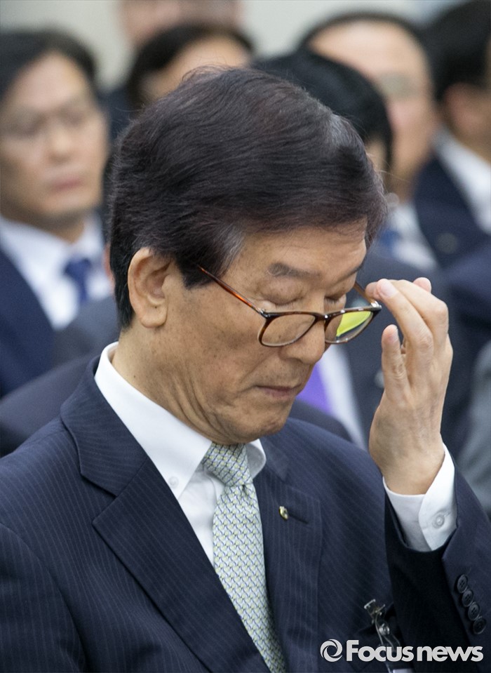 (서울=포커스뉴스) 30일 오전 서울 여의도 국회에서 열린 정무위원회 전체회의에 참석한 이동걸 한국산업은행장이 안경을 만지고 있다.