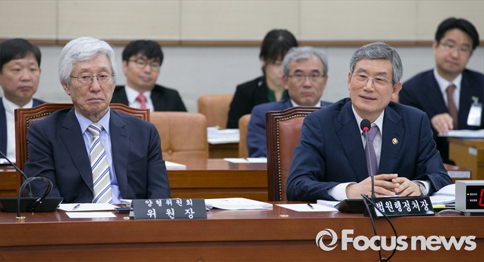(서울=포커스뉴스) 30일 오전 서울 여의도 국회에서 열린 법제사법위원회 전체회의에 참석한 고영한 법원행정처장이 의원들의 질의에 답하고 있다. 왼쪽은 이진강 양형위원장.
