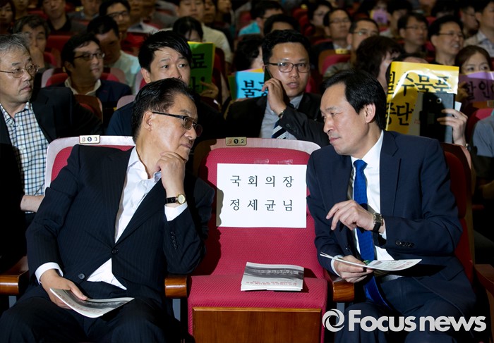 (서울=포커스뉴스) 30일 오후 서울 여의도 국회 의원회관에서 열린 전국가맹점주 피해사례 발표 및 관련법 개정촉구 대회에 참석한 우상호(오른쪽) 더불어민주당 원내대표와 박지원 국민의당 원내대표가 대화하고 있다.