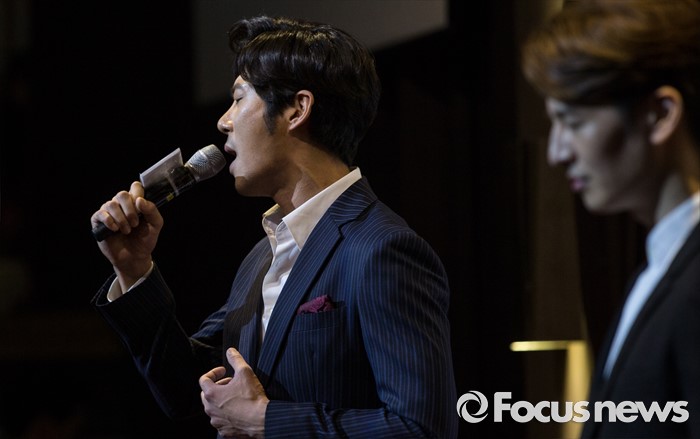 (서울=포커스뉴스) 30일 오후 서울 성동구 디노체 컨벤션에서 열린 뮤지컬 '페스트' 제작발표회 참석한 배우 박은석(왼쪽)이 뮤지컬넘버를 시연하고 있다.