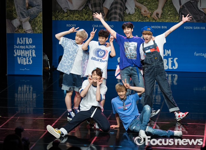 (서울=포커스뉴스) 30일 오후 서울 강남구 일지아트홀에서 열린 아이돌 그룹 아스트로의 두번째 미니앨범 'Summer Vibes' 발표 쇼케이스에 참여한 멤버들이 신곡무대를 선보이고 있다.