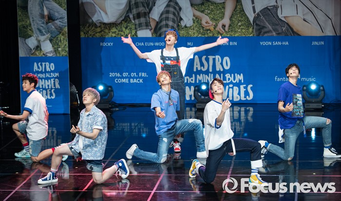 (서울=포커스뉴스) 30일 오후 서울 강남구 일지아트홀에서 열린 아이돌 그룹 아스트로의 두번째 미니앨범 'Summer Vibes' 발표 쇼케이스에 참여한 멤버들이 신곡무대를 선보이고 있다.
