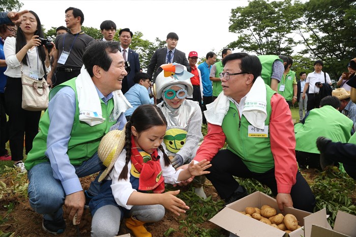 (서울=포커스뉴스) 이동필 농림축산품부 장관이 30일 서울 여의도 국회 헌정기념관 앞 잔다밭에서열린 국회 상생텃밭 개장식에 참석해 정세균 국회의장 등 참석자들과 감자를 수확하고 있다. <사진제공=농림축산식품부>