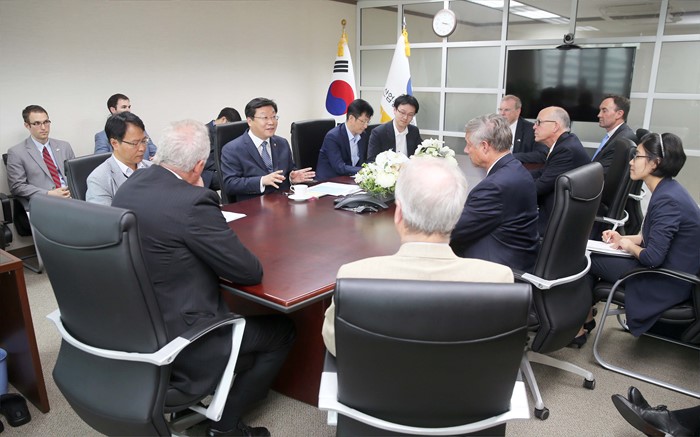 (서울=포커스뉴스) 주형환 산업통상자원부 장관이 30일 서울 외교부청사 집무실에서 프레드 업턴(Fred Upton) 美 연방 에너지·상업위 위원장 등 하원의원단(6명)의 예방을 받고, 한미 FTA 및 에너지 협력에 관해 의견을 교환하고 있다. <사진제공=산업통상자원부>