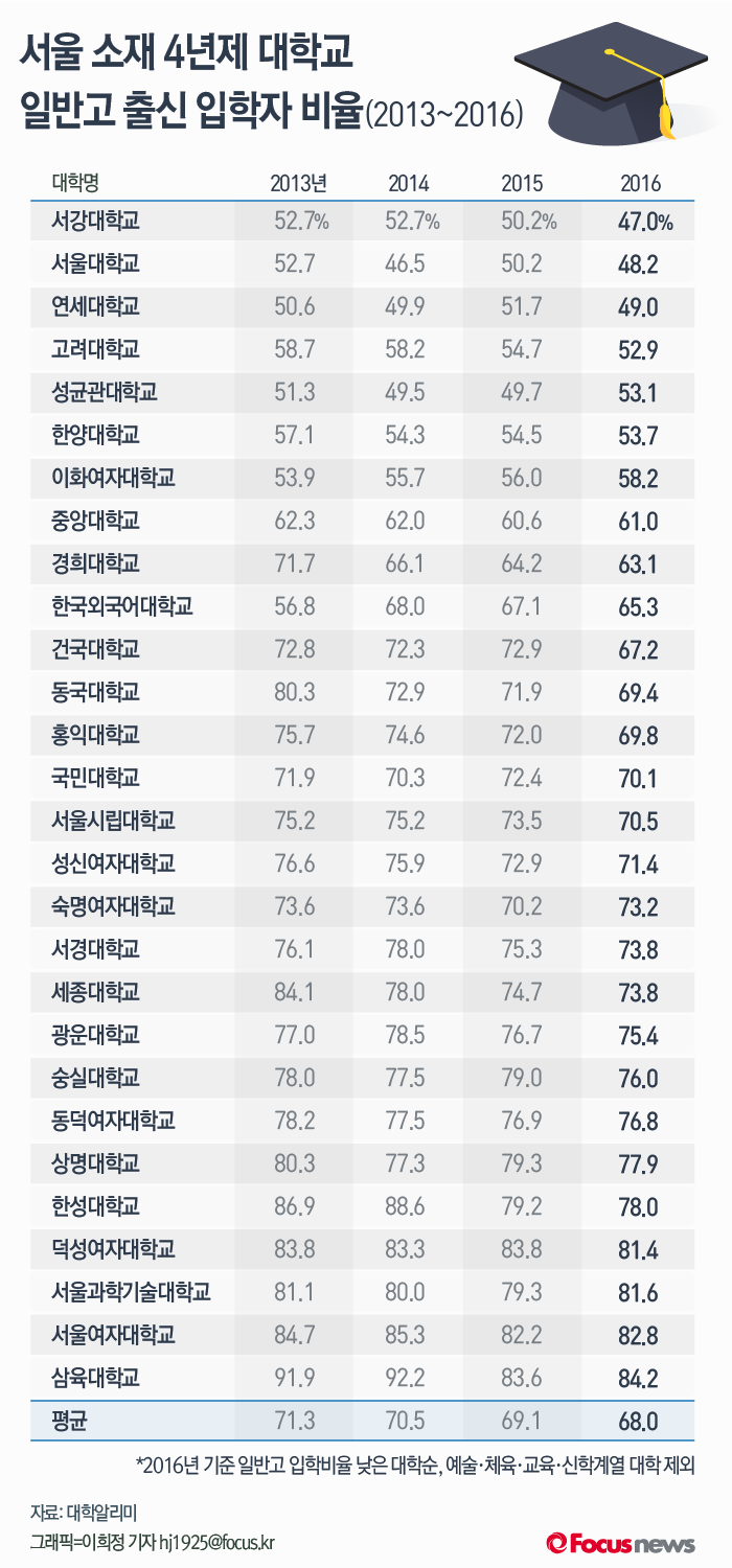 (서을=포커스뉴스) 포커스뉴스가 최근 4년간 서울 소재 28개 대학교 입학생 현황(예술·체육·신학·교육 계열 대학교 제외)을 살펴본 결과 2013년 평균 71.3%였던 일반고 출신자 비율이 해마다 감소해 2016기준 68%까지 떨어졌다.