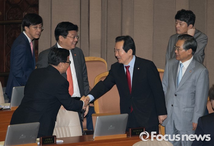 (서울=포커스뉴스) 4일 오전 서울 여의도 국회에서 열린 343회 국회(임시회) 6차 본회의, 경제에 관한 대정부 질문에 참석한 정세균 국회의장이 국무위원들과 인사하고 있다.