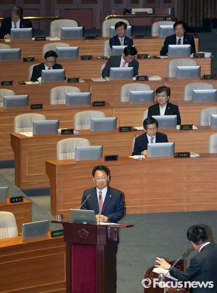 (서울=포커스뉴스) 4일 오전 서울 여의도 국회에서 열린 343회 국회(임시회) 6차 본회의, 경제에 관한 대정부 질문에 참석한 유일호 경제부총리 겸 기획재정부 장관이 이종구 새누리당 의원의 질문에 답하고 있다.