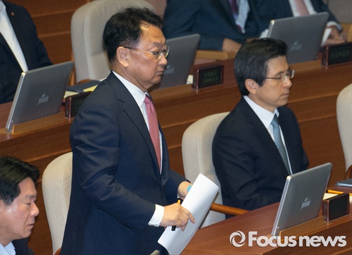 (서울=포커스뉴스) 4일 오전 서울 여의도 국회에서 열린 343회 국회(임시회) 6차 본회의, 경제에 관한 대정부 질문에 참석한 유일호 경제부총리 겸 기획재정부 장관이 답변을 위해 단상으로 향하고 있다. 오른쪽은 황교안 국무총리.