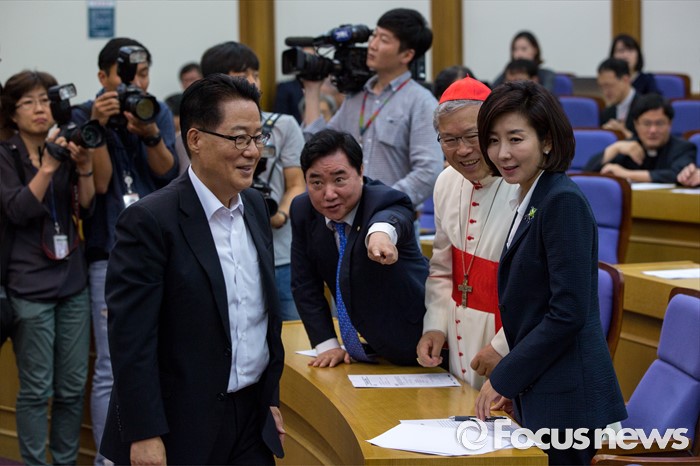 (서울=포커스뉴스) 박지원(왼쪽) 국민의당 비상대책위원장이 4일 오전 서울 여의도 국회의원회관에서 열린 '생명존중포럼 창립총회'에 참석해 염수정(오른쪽 두 번째) 추기경과 인사를 나눈 뒤 자리로 향하고 있다.
