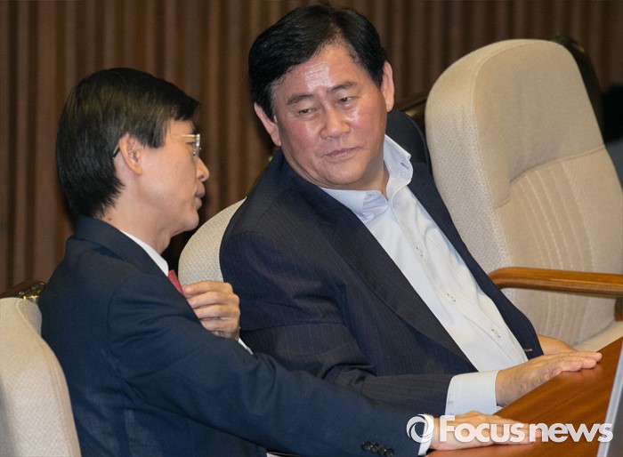 (서울=포커스뉴스) 4일 오후 서울 여의도 국회에서 열린 343회 국회(임시회) 6차 본회의, 경제에 관한 대정부 질문에 참석한 최경환(오른쪽), 조경태 새누리당 의원이 대화하고 있다.
