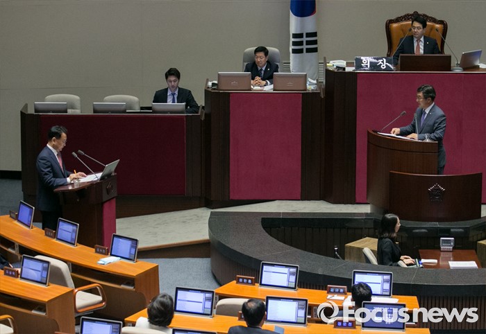 (서울=포커스뉴스) 4일 오후 서울 여의도 국회에서 열린 343회 국회(임시회) 6차 본회의, 경제에 관한 대정부 질문에 참석한 유일호(왼쪽) 경제부총리 겸 기획재정부 장관이 윤호중 더불어민주당 의원의 질문에 답하고 있다.