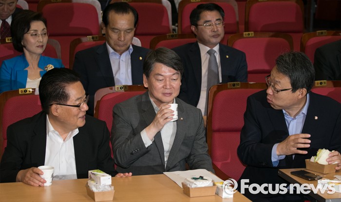 (서울=포커스뉴스) 5일 오전 서울 여의도 국회 의원회관에서 열린 국민의당 성희롱 예방교육에 참석한 안철수(가운데) 전 대표와 박지원(왼쪽) 비대위원장, 김성식 정책위의장이 대화하고 있다.