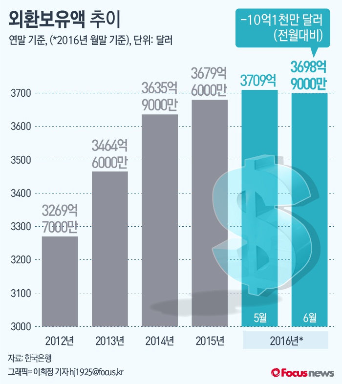 (서울=포커슨뉴스) 4일 한국은행은 '2016년 6월말 외환보유액' 자료를 통해 올 6월 외환보유액이 3698억달러로 전월대비 하락했다고 밝혔다.