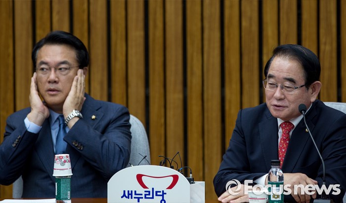 (서울=포커스뉴스) 박명재 새누리당 사무총장이 5일 오전 서울 여의도 국회에서 열린 원내대책회의에 참석해 모두발언 하고 있다.