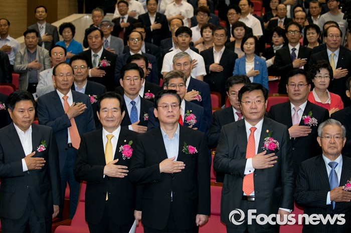 (서울=포커스뉴스) 5일 오전 서울 여의도 국회 의원회관에서 열린 미래성장 경제정책포럼 창립총회에 참석한 홍문종(앞줄 왼쪽부터) 새누리당 의원, 정세균 국회의장, 정우택 새누리당 의원, 주형환 산업통상자원부 장관, 권태신 한국경제연구원장 등 참석자들이 국기에 대한 경례를 하고 있다.