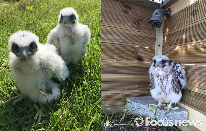 (인천=포커스뉴스) 지잔 4월경남야생동물구조센터에구조되어 올 당시의송골매 남매(왼쪽) 와인천 수도권 매립지 들녘의해킹시스템 안으로 이주했을 때의 송골매 유조 <사진제공=박상현>