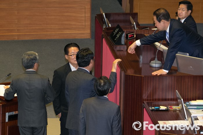 (서울=포커스뉴스) 5일 오전 서울 여의도 국회에서 열린 343회 국회(임시회) 7차 본회의, 정치·외교·통일·안보·교육·사회·문화에 관한 질문에 참석한 김동철 국민의당 의원과 이장우 새누리당 의원 등 의원들의 언쟁으로 정진석 새누리당 원내대표, 우상호 더불어민주당 원내대표, 박지원 국민의당 원내대표와 박주선 국회 부의장이 회의 정회를 논의하고 있다.