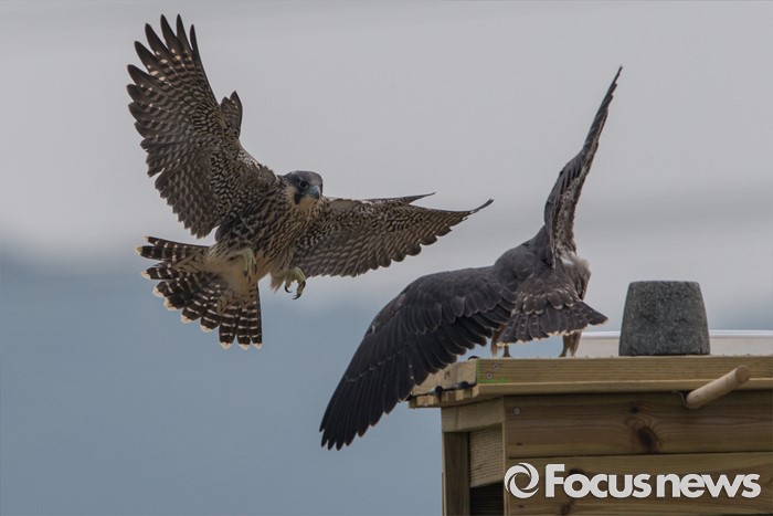 (인천=포커스뉴스) 송골매 유조 수컷(왼쪽)이6월초 첫 비행후수도권매립지에 설치 된 해킹시스템으로 돌아오고 있다.