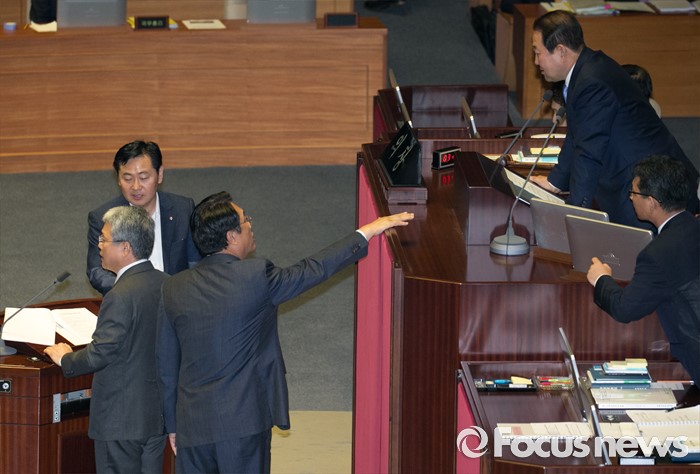 (서울=포커스뉴스) 5일 오전 서울 여의도 국회에서 열린 343회 국회(임시회) 7차 본회의, 정치·외교·통일·안보·교육·사회·문화에 관한 질문에 참석한 이장우 새누리당 의원 등과 김동철 국민의당 의원이 언쟁을 벌이자 정진석 새누리당 원내대표, 박주선 국회 부의장, 김관영 국민의당 원내수석부대표가 논의하고 있다.