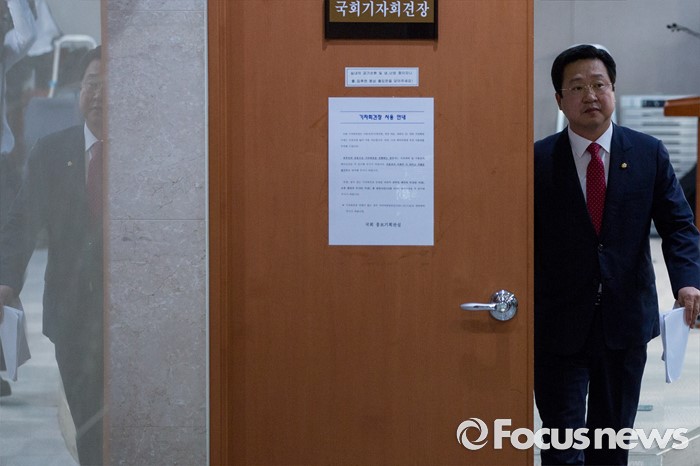 △ 기자회견장 나서는 이장우 새누리당 의원