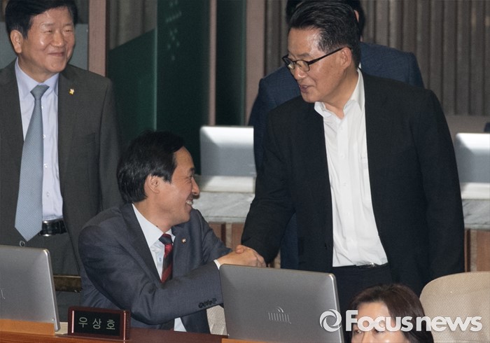 (서울=포커스뉴스) 5일 오후 서울 여의도 국회에서 열린 343회 국회(임시회) 7차 본회의, 정치·외교·통일·안보·교육·사회·문화에 관한 질문에 참석한 우상호(왼쪽) 더불어민주당 원내대표와 박지원 국민의당 원내대표가 악수하고 있다.