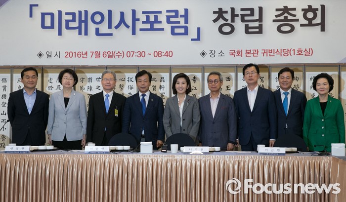 (서울=포커스뉴스) 6일 오전 서울 여의도 국회 귀빈식당에서 열린 미래인사포럼 창립총회에 참석한 나경원 새누리당 의원, 이근면 전 인사혁신처장 등 참석자들이 기념촬영을 하고 있다.