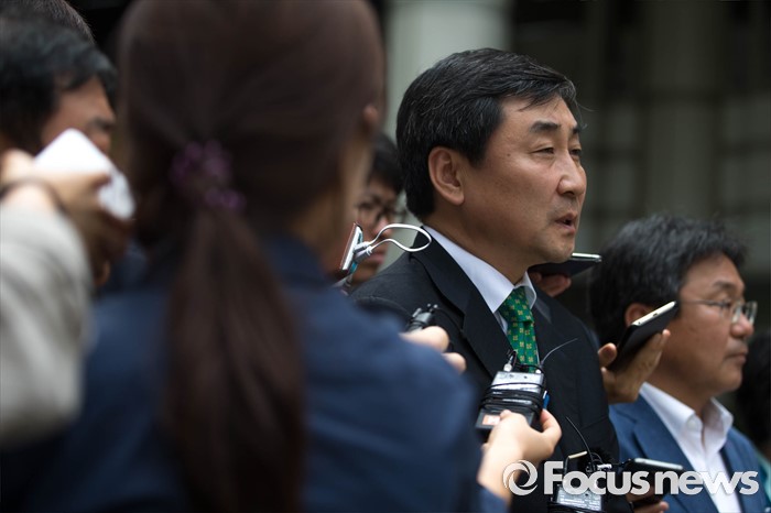 (서울=포커스뉴스) 2012년 대선을 앞두고 발생한 '국정원 여직원 감금 사건' 재판 선고가 내려진 6일 오전 서울 서초구 서울중앙지법 앞에서 이종걸 더불어민주당 의원이 재판 선고 후 법원 앞에서 취재진과 인터뷰를 하고 있다.