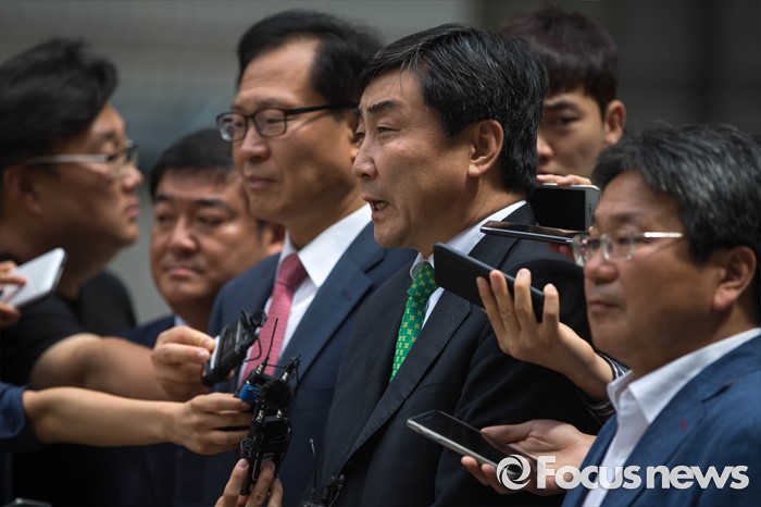 (서울=포커스뉴스) 2012년 대선을 앞두고 발생한 '국정원 여직원 감금 사건' 재판 선고가 내려진 6일 오전 서울 서초구 서울중앙지법 앞에서 이종걸 더불어민주당 의원이 재판 선고 후 법원 앞에서 취재진과 인터뷰를 하고 있다.