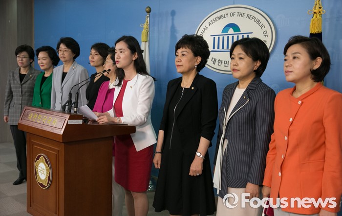 (서울=포커스뉴스) 6일 오전 서울 여의도 국회 정론관에서 새누리당 여성 의원들이 표창원 더불어민주당 의원의 대정부 질문 중 학교전담경찰관 발언 논란과 관련 사과 촉구 기자회견을 하고 있다. 왼쪽부터 최연혜, 윤종필, 김승희, 전희경, 이은재, 신보라, 김순례, 송희경, 김정재 의원.