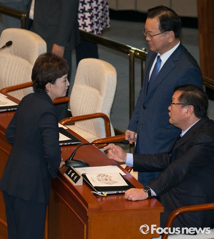 (서울=포커스뉴스) 6일 오전 서울 여의도 국회에서 열린 예산결산특별위원회 전체회의에 참석한 김현미(왼쪽) 위원장과 김태년 더불어민주당 간사, 김부겸 의원이 대화하고 있다.