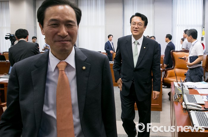 (서울=포커스뉴스) 6일 오후 서울 여의도 국회에서 운영위원회 전체회의를 마친 정진석(오른쪽) 새누리당 원내대표와 우상호 더불어민주당 원내대표가 이동하고 있다.