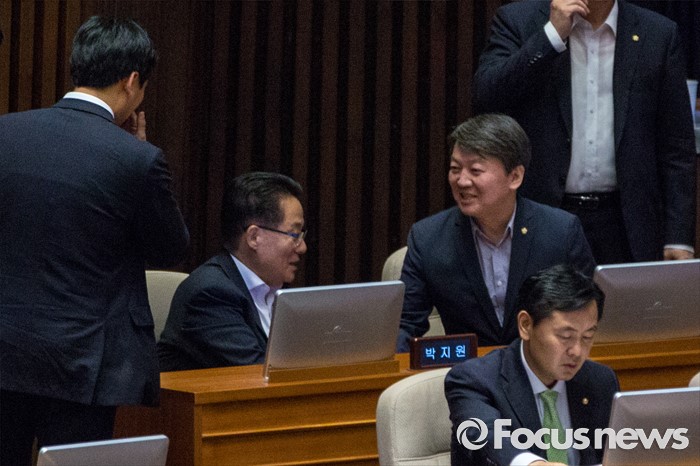 (서울=포커스뉴스) 박지원(왼쪽) 국민의당 비상대책위원장과 안철수 국민의당 전 상임공동대표가 6일 오후 서울 여의도 국회에서 열린 '제343회 국회(임시회) 제8차 본회의'에 참석해 대화 하고 있다.