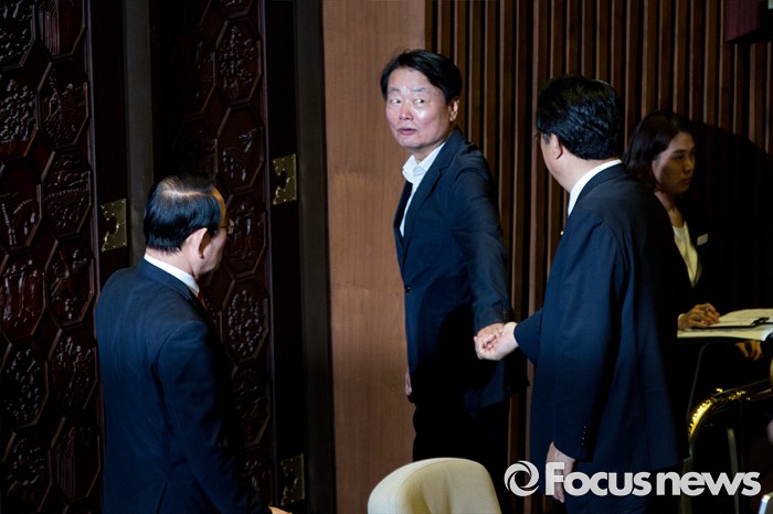 (서울=포커스뉴스) 정진석(오른쪽) 새누리당 원내대표와 한선교(가운데) 새누리당 의원이 6일 오후 서울 여의도 국회에서 열린 '제343회 국회(임시회) 제8차 본회의'에 참석해 대화 하고 있다.