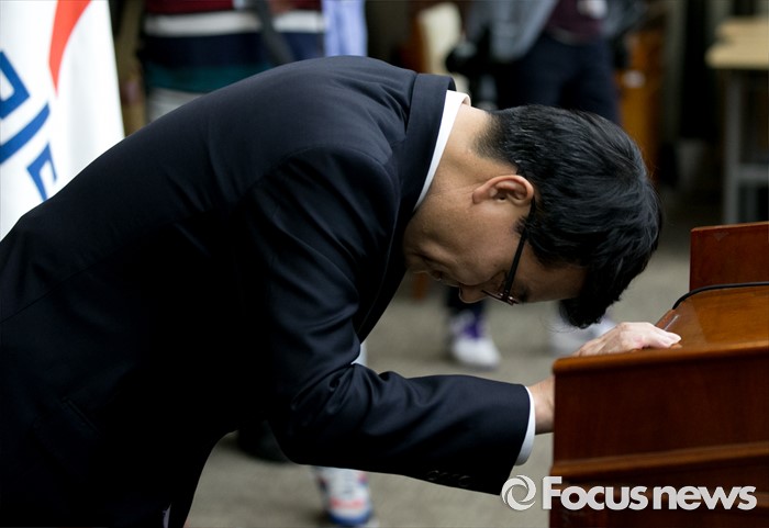 (서울=포커스뉴스) 6일 오후 서울 여의도 국회에서 열린 새누리당 의원총회에 참석한 윤상현 의원이 복당 인사말을 마친 뒤 인사하고 있다.