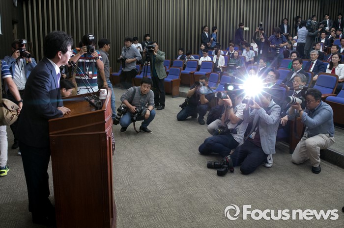 (서울=포커스뉴스) 6일 오후 서울 여의도 국회에서 열린 새누리당 의원총회에 참석한 유승민 의원이 복당 인사말을 하고 있다.