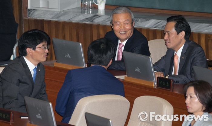 (서울=포커스뉴스) 6일 오후 서울 여의도 국회에서 열린 343회 국회(임시회) 8차 본회의에 참석한 김종인 더불어민주당 비대위 대표, 우상호 원내대표 등 의원들이 대화하고 있다.