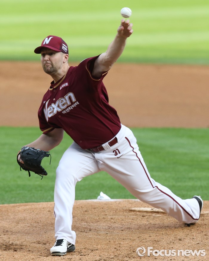(서울=포커스뉴스) 6일 서울 잠실구장에서 열린 2016 프로야구 넥센-두산 경기에서 1회말 넥센 선발투수 피어밴드가 투구하고 있다.