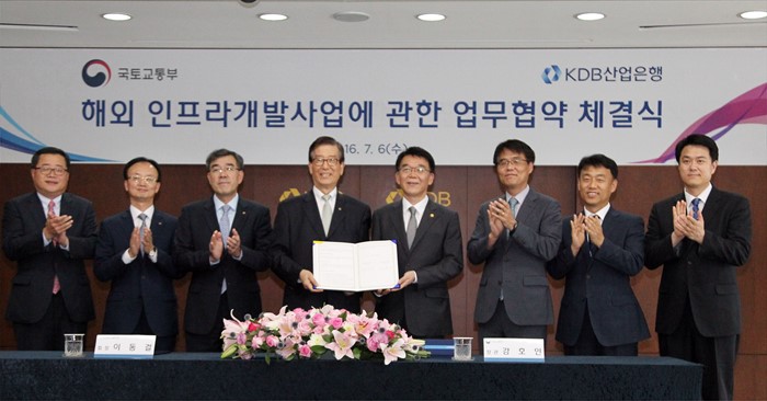 (서울=포커스뉴스) 강호인 국토교통부장관이 이동걸 한국산업은행 회장과 6일 서울 여의도 산업은행 본점에서 해외인프라개발사업 지원에 관한 업무협약을 체결하고 있다. <사진제공=국토교통부>